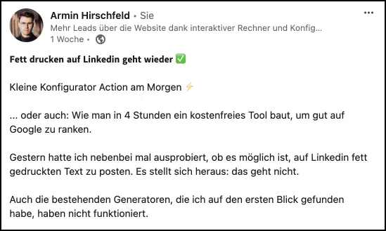 Vielleicht ging das mal in der Vergangenheit, weil ich viele solcher Konfiguratoren gefunden habe, die mir fetten Text zum Kopieren anbieten, aber wenn man diesen postet, wandelt Linkedin die fetten Textbausteine automatisch in unformatierten Text um.